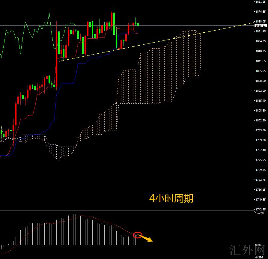 四小时周期我们将关注到在今早刷新1870名置后形成了一根十字星转变形态,而MACD量柱在这里也逐渐呈现缩量态势,整体的情形供应给了我们空单持续持有的参考。那么假使今日行情行情顺应我们的分析走下挫行情,我们暂将平仓计划位定在1858及黄色趋势线(1854左右)。