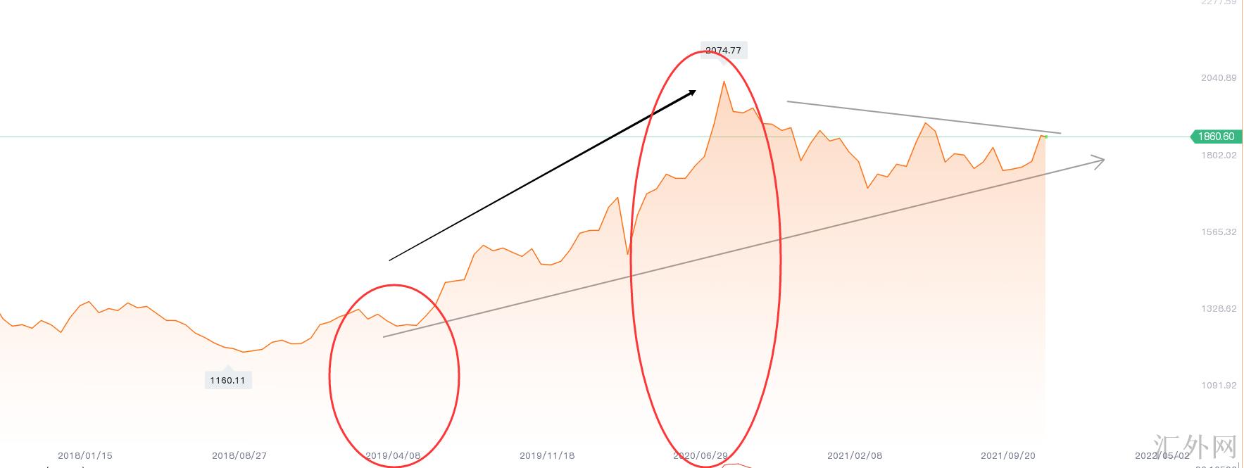 接连五个月的大涨,每一天都有被高峰吸引来的投资人,尤其是在1680—1744的平台区冲破后面,进场“抄顶”的以及顺势加仓的不计其数,伴随8月顶点2074的来临,市场气氛被全面点燃!伴随九月的来临,世界都习惯了“与病毒同在”,再加之黄金的升幅高涨吸引来较多的新人投资人,主力收割韭菜的心思动了,黄金从九月起跌,迄今未能显现重回2000荣光的痕迹。