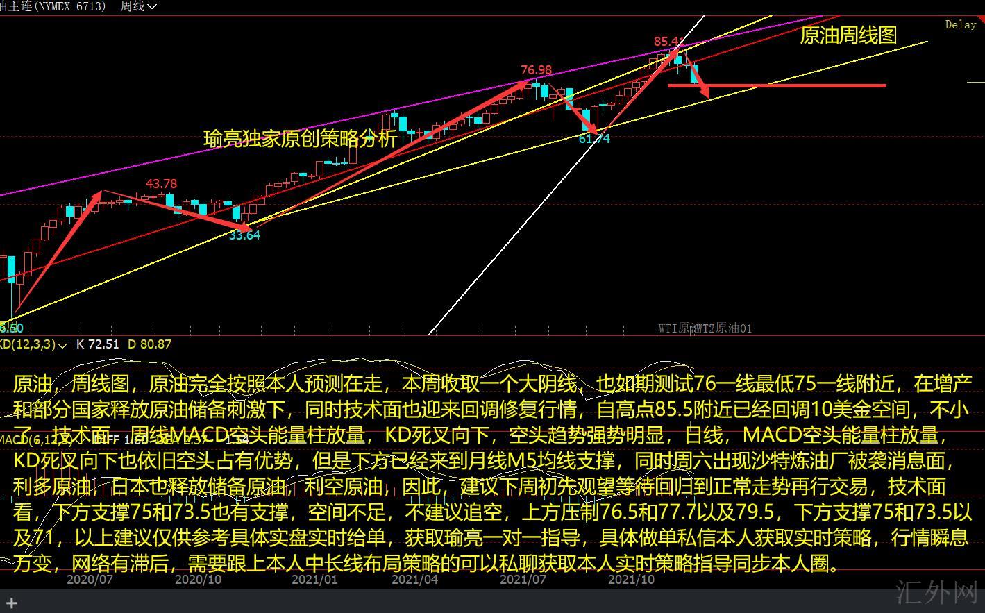 原油,周线图,原油完全依照本人预期在走,这周收取一个大阴线,也按计划试探76一线最低75一线左右,在增产和部分国家放出原油储备刺激下,同期技术分析也面临回踩修复行情,自高位85.5左右已经回踩10美金空间,不小了,技术分析,周线MACD卖方能量柱放量,KD死叉朝下,卖方趋势强劲显著,日K线,MACD卖方能量柱放量,KD死叉朝下也依旧卖方占有优势,但是以下已经到达月线M5均线支撑,同期星期六显现沙特炼油厂被袭消息面,有好处多头原油,日本也放出储备原油,有好处空头原油,所以,推荐下周初先观望等候回到到正常行情再行交易,技术分析看,以下支撑75和73.5也有支撑,空间不足,不提倡追空,上方抑制76.5和77.7以及79.5,以下支撑75和73.5以及71,以上推荐仅供参考具体实盘实时给单,获取瑜亮一对一指导,具体做单私信本人获取实时策略,行情瞬息万变,网络有落后,需求跟上本人中长线布局策略的可以私聊获取本人实时策略指导同步本人圈。