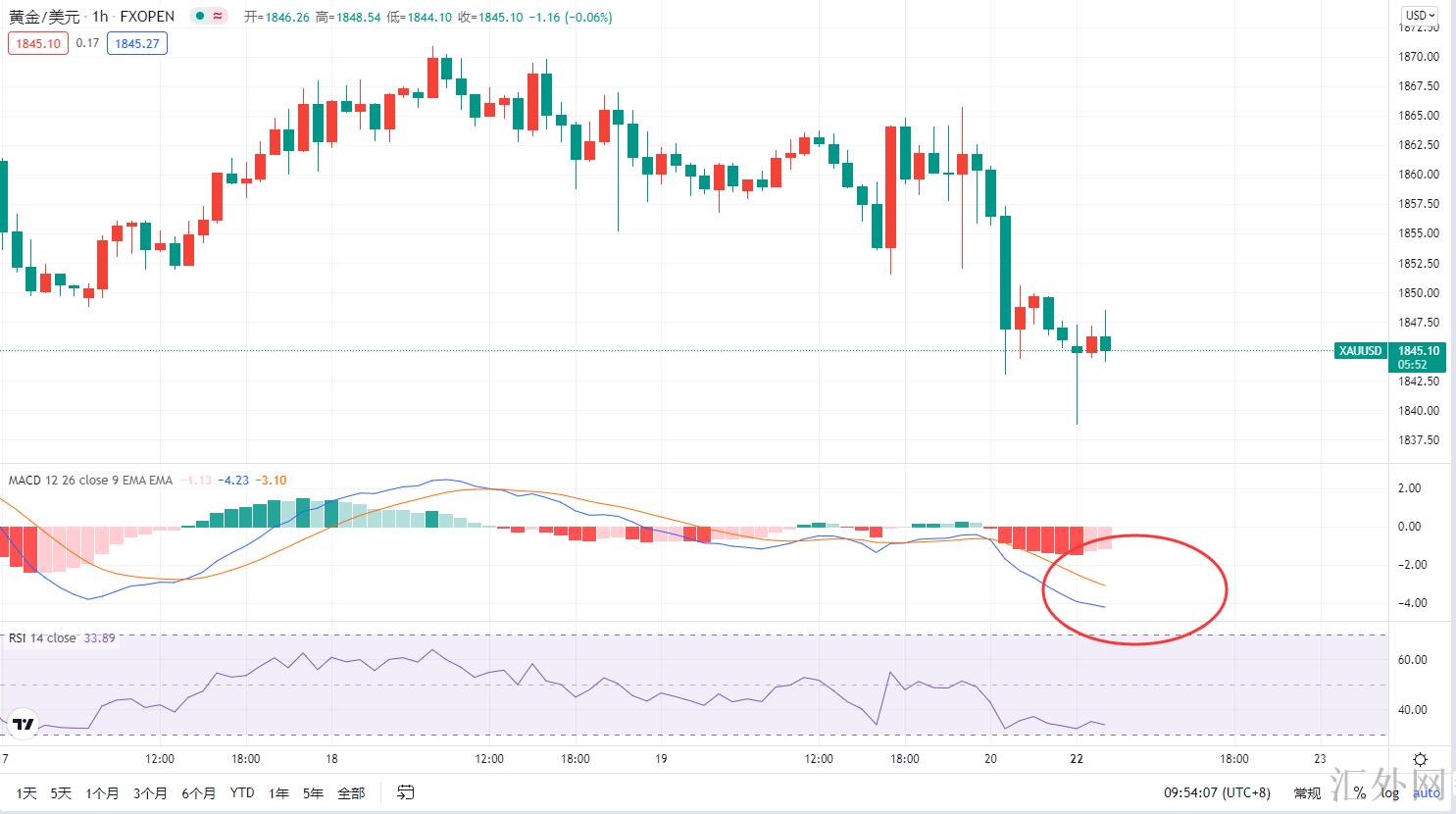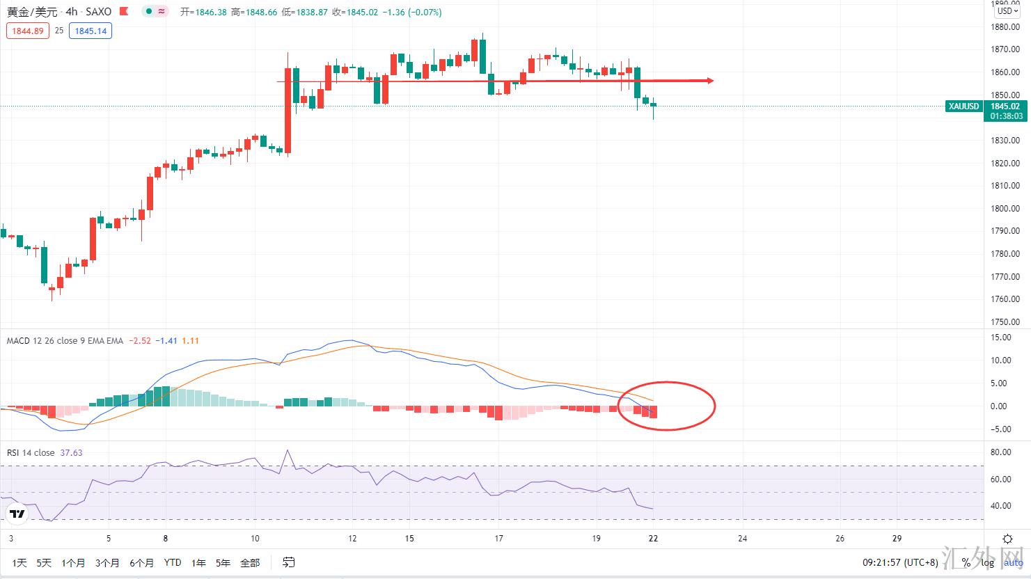 我尽管是个卖方,但是并没有盲目积极,黄金日K线级别的MACD快慢线已经高点萎缩黏合了,而且已经开始显现死叉了,但是我为何并没有积极呢?来说小时级别!
