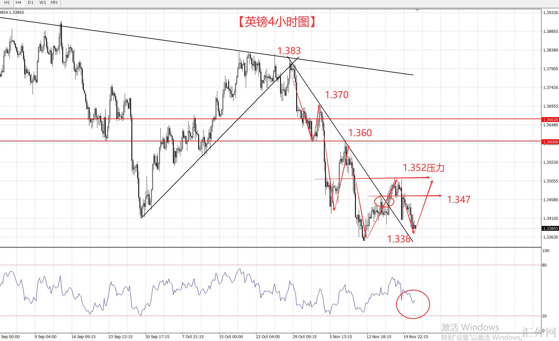 此外,4小时的英镑结构图表明,早前下探结构在11月17号做到击穿后面,英镑就开始于1.351遇阻,而且经历长时间的回踩后,并没有从新回归1.383以来的下探趋势的以下,而是选择于这段趋势线为转换,持续试探回弹,当前已经又一次试探1.338,然而并没有更深一步保持的意思,k线也没有击穿这一支撑,rsi指标拐头线已经显现,给回弹也是打下了基础,所以今天只需求注意这段趋势线的支持1.338和前低1.335的支持,上方短时间阻力还在1.351。