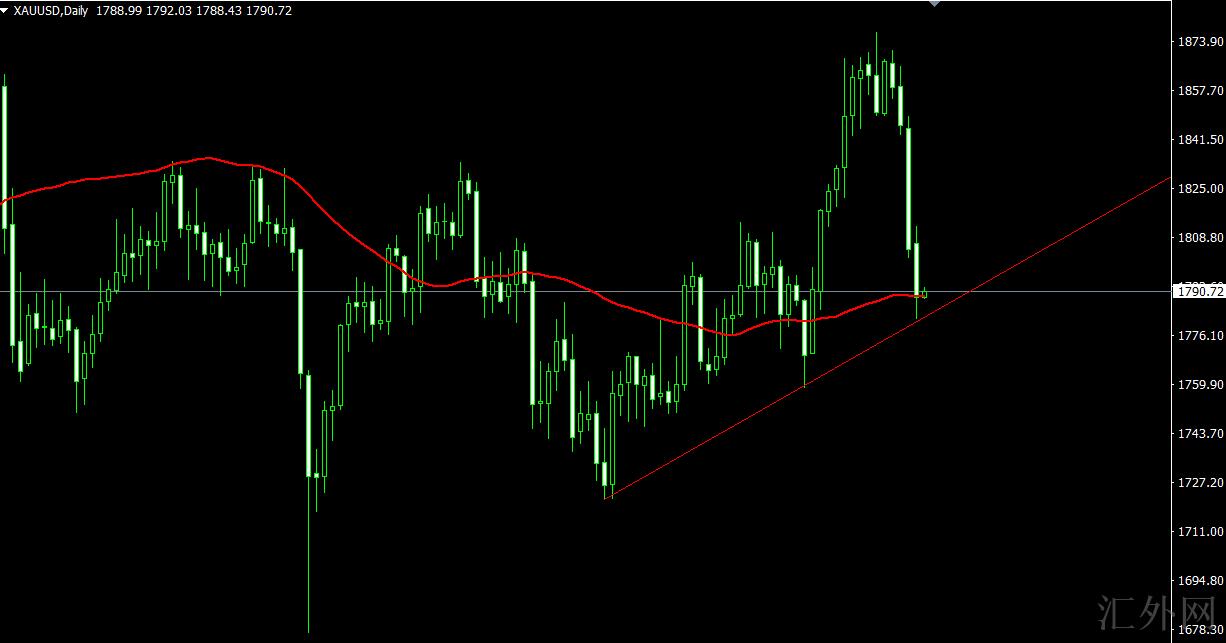 黄金昨晚最低刷新1781左右,恰好是618的位置,也是趋势线支撑,日K线收阴。