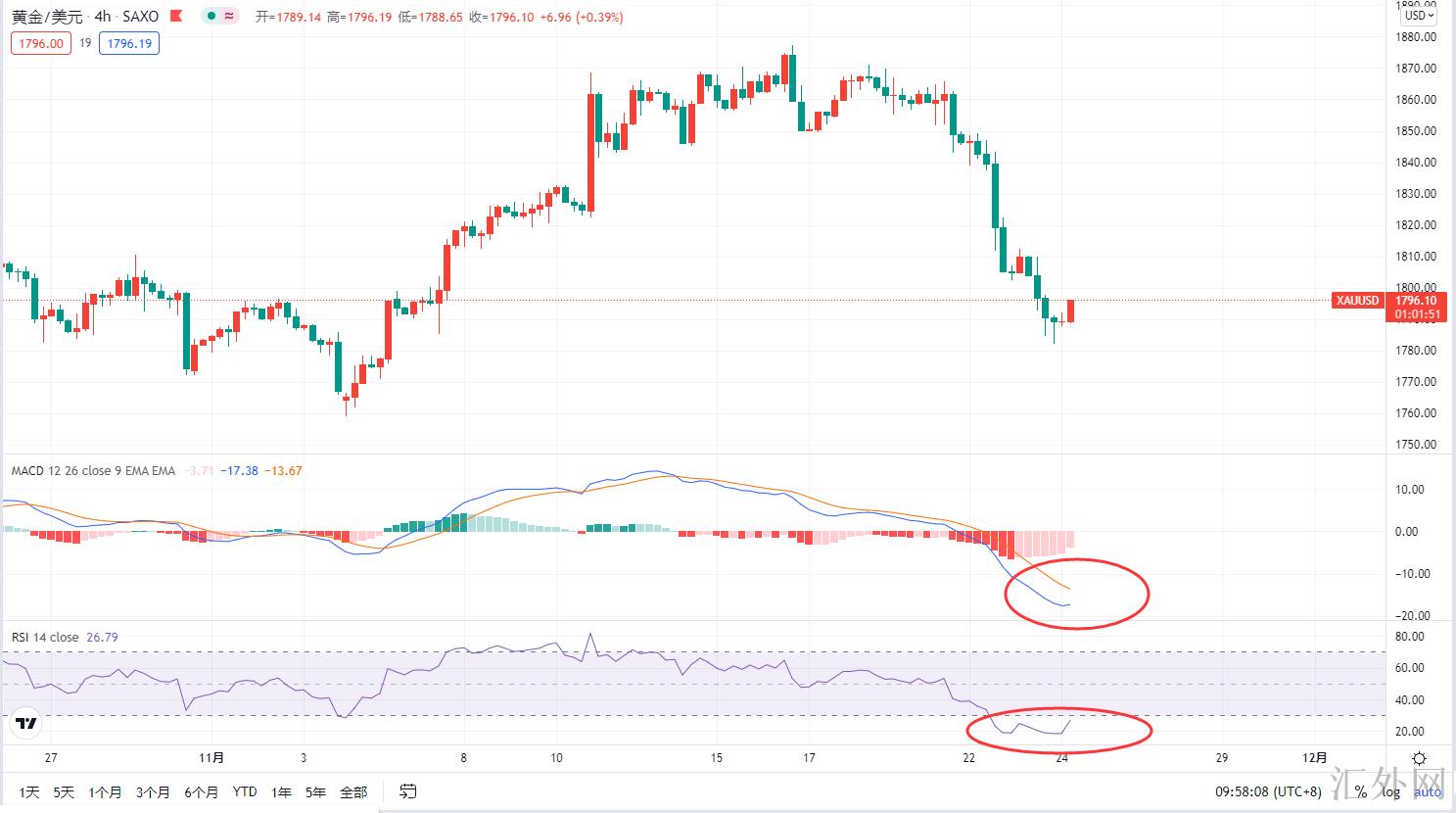 隔夜黄金最低试探1782一线,该位置是前期在1835一线的震荡低位,支撑较强,而且从4小时的收线来说,接连两根K线都带有长长的下影线,仍在低点迈出一根锤子线,在锤子线后面一根十字星,十字星后面开始推涨,4小时的底部也比较显著了,核心是MACD快慢线开始由显著的拐头了,这是一个好消息,预期黄金4小时会在1小时和15分钟形态的配合下今天迈出回弹!