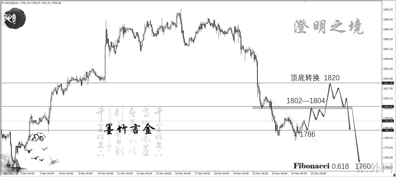 受美国感恩节假日影响,今天和明日美盘全将提早收盘,市场的成交量将广泛下跌,所以今明两日黄金位于1782—1804区间震荡修正是最好的调动状态,下周初打击1820—1833区间后,展开保持性溃败下挫,这是现在我给黄金的框架,交易中还将依照该思路实施!