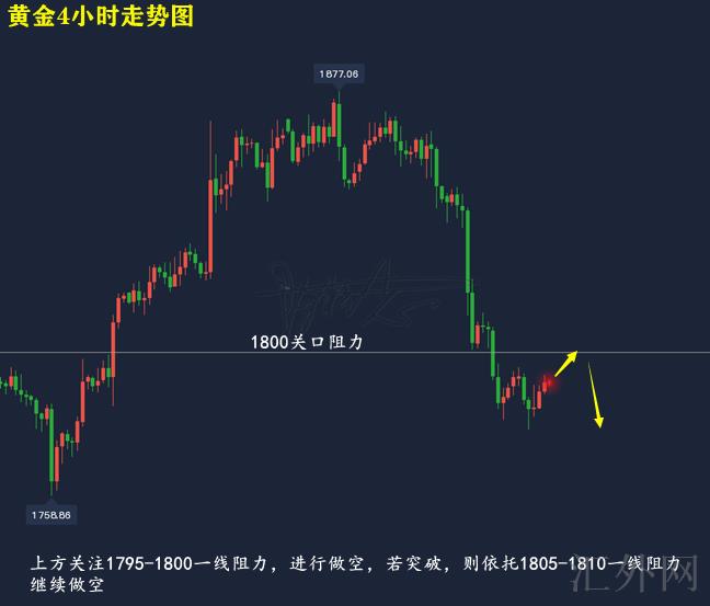 黄金技术分析来分析,日K线上,星期三黄金亚盘上升后下挫,并在夜里新低后回涨,报得小阴十字星,日K线上,今日行情回涨,但行情仍遇阻于千八关键点位以下,预期恐会大约率持续遇阻下探;4小时上,星期三黄金亚盘上升后遇阻MA10日移动均线回调,并在新低后回涨持稳均线上方,目前布林带处在开口期,MA均线在呈卖方排列后,MA5-10日移动均线有拐头往上态势,KDJ随机指标三线并拢往上,到达超买,MACD指标红色量能柱开始显现,快慢线金叉往上,综合来说,黄金当前仍未打破上方抑制,日间推荐维持买跌,上方注意1795-1800一线压力,其次1805-1810一线压力。