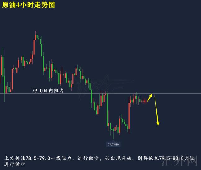 原油技术分析来分析,日K线上,星期三原油开盘展开回涨,在短线刺破MA10日移动均线后展开回调,盘中报得带长上影线的小阴,日K线上,今日行情开盘适当上升,但遇阻于MA10日移动均线,预期仍会遇阻;4小时上,星期三原油持于最近高点运行后展开适当回踩,持续持于78关键点位上方徘徊,目前布林带处在开口期,MA均线5日K线朝下形死叉,KDJ随机指标三线并拢朝下,MACD指标红色量能柱开始缩量,快慢线有朝下趋势,综合来说,日间推荐持续维持买跌,上方注意78.5-79.0一线压力,若行情显现击穿则在依托79.5-80.0大阻执行买跌。