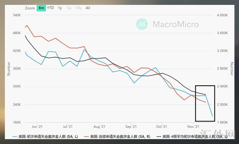 黑框框出来的部分是11月的报告,四周平均和续请都只有前两周,而初请就不用我再强调了吧,52年来新低不是跟你开玩笑的,即使这个报告它再跟感恩节大家离职意向低相关,那也不至于创个这么低的报告出来,毕竟每年都有感恩节,但也不是每个感恩节都能整这么一出的,所以企业们的留人能力也得到了极大地体现,也就是说,就业市场在以一个相当出色的状态在连续恢复。