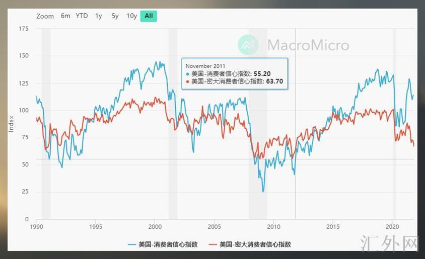 最近有关美联储加速taper的话题我们经常在提,慷慨往上也有做过归纳,也就是要看两点:第一是通货膨胀究竟有没有真正损害经济;第二是就业市场究竟有没有更深一步改观。而这两个困难的答案在昨天发布的报告中就能目睹,首先就是密大消费者信心指数创10年新低: