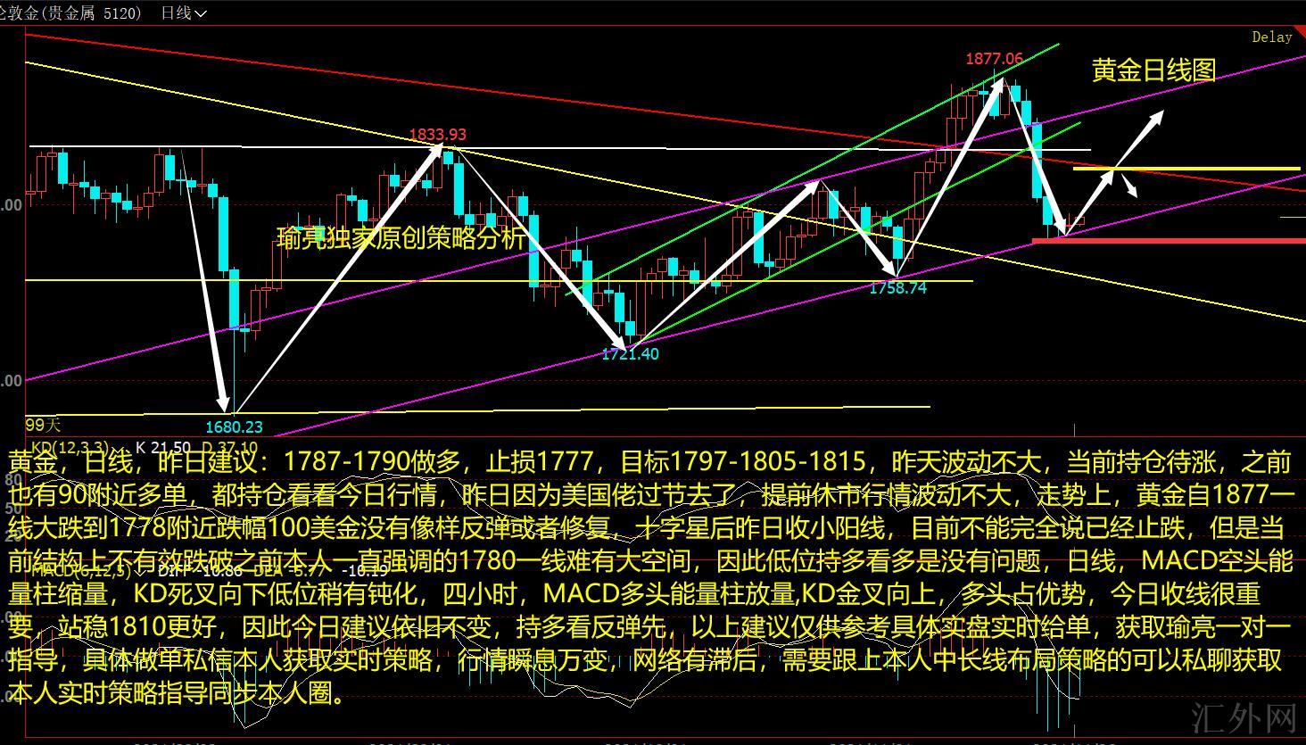 黄金,日K线,昨日推荐:1787-1790买涨,止损1777,计划1797-1805-1815,昨天震荡不大,目前持仓待涨,以前也有90左右多单,都持仓看看今日行情,昨日由于美国佬过节去了,提早休市行情震荡不大,行情上,黄金从1877一线暴跌到1778左右降幅100美金没有像样回弹或者修复,十字星后昨日收小阳线,当前不能完全说已经止跌,但是目前结构上不有效跌穿以前本人一直强调的1780一线难有大空间,所以低点持多看涨是没有困难,日K线,MACD卖方能量柱缩量,KD死叉朝下低点略有钝化,四小时,MACD买方能量柱放量,KD金叉往上,买方占优势,今日收线很重要,立住1810更好,所以今日推荐依旧不变,持多看回弹先,以上推荐仅供参考具体实盘实时给单,获取瑜亮一对一指导,具体做单私信本人获取实时策略,行情瞬息万变,网络有落后,需求跟上本人中长线布局策略的可以私聊获取本人实时策略指导同步本人圈。
