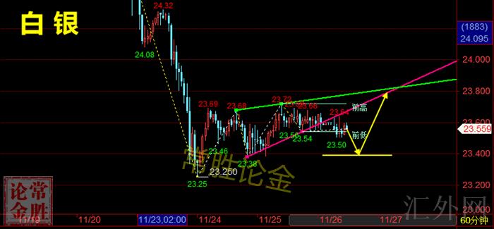 黄金分割轴心点指标体系展示日间三大支撑分别为23.51-23.46-23.38,上方压力为23.67-23.72-23.80.中轴23.59。预期今天银价在S1-S2区间得到更强势的做多盘支撑后,上破R3压力。