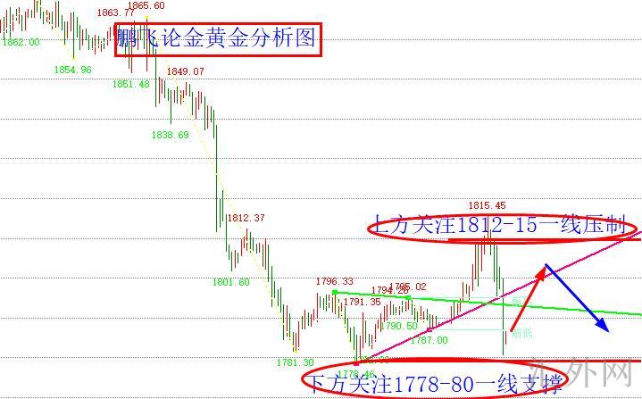 从4小时来说,黄金价格在1796遇阻后,执行了一次二次测底,而且适当创下低位1778一线,形成了1小时级别的2段底背离状态,下挫量能减缓显著,在朝下击穿迈出新低后面,4小时下挫结构的顶底转换位已经由1804移动至了1788,今天上午上升过程中,有从新收回此位置,4小时从新立稳1788后面,从1877的下挫结构已经遭到损坏,表明行情下挫已经到了末端,而且有终结的痕迹,今天日间击穿1796昨天高位,会是下挫终结的证实信号,而且会在此位置形成双底的底部形态,到时的上涨计划注意1804以及1822,布局层面可以等候k线回踩1788斟酌入场多单,或者等候1796击穿形成底部后再介入,受于上升量能当下还不是很强,加之今天感恩节休市,交投量清淡,所以在布局层面,尽量多点耐心。综合来说,今日黄金短线交易参考上鹏飞论金推荐高空为主,低多为辅,上方着重注意1813-1818一线压力,以下短时间着重注意1780-1778一线支撑。
