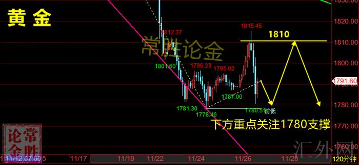 黄金在星期五迈出过山车行情,从开盘1788左右最高上升到1815左右,随后又跌至这周低位1780左右,收盘在1791左右,周线收得大阴线。单从周线来说,下周仍有一跌,但从日K线向上瞧又下不去。周线关注上方压力1840左右,月线收线以前难到达。以下支撑就是这周的低位1778,假使开盘现货金再跌穿1778,或许就去1760甚到1745左右。当前小时线支撑1785压力1797,下星期一亚盘注意1785-1797区间突破,往上击穿看1806-1814左右,朝下击穿看1778。