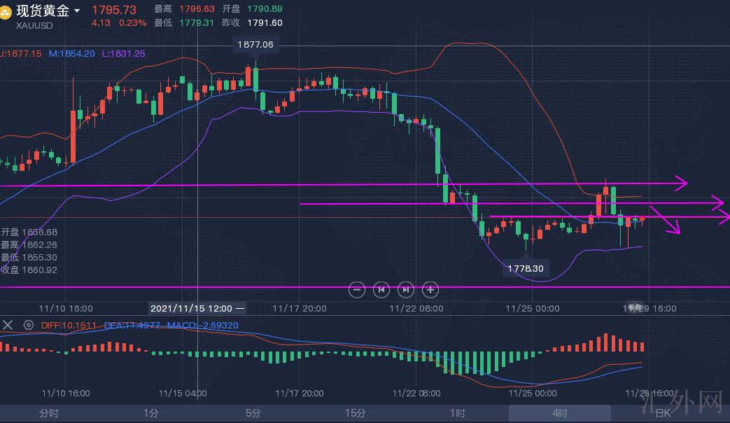 黄金层面、上星期五金价上演冲顶回调,最高刷新1815.5左右,对1812-13抑制形成刺破实体仍遇阻1813之下。从整体结构来说,上星期五高位1815.5高位修正一步到位,凌晨震荡回调又一次到达1780左右,整体结构偏空。早间黄金呈现跳空低开,但价格试探1780左右支撑后面又一次形成持稳。受于1780左右支撑多次试探仍未形成有效击穿,当前四小时布林带收口走平,黄金短时间或许显现低点反复整理,后期或许会显现破低动作,但破低后面走保持机会并没有大,以下务必朝下击穿日K线形成上涨趋势线支撑以及1758前低核心支撑才可又一次打开以下空间,短线交易参考上高抛低吸均可。