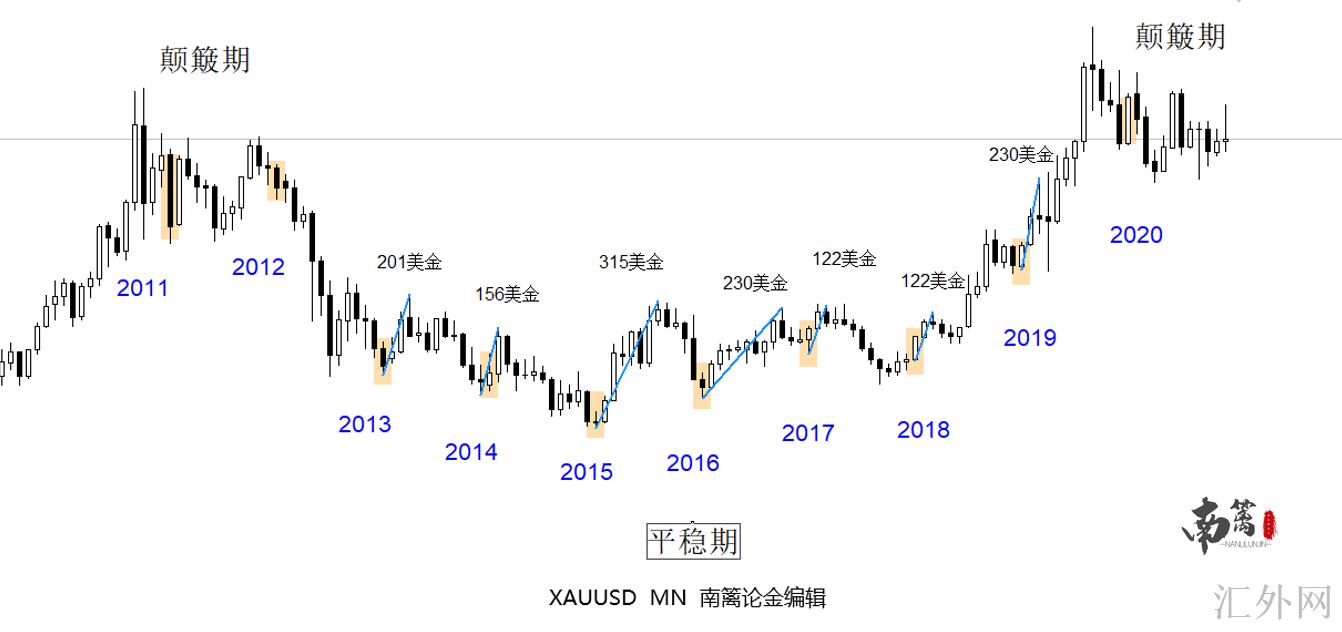 以上为从2011年开始的十二月份烛体(橙色方框覆盖),分成两个层面来看,稳定期的黄金在年度末都肩负着次年第一季度黄金的起涨作用,从2013年——2019年,少则120美金,多则保持半年升幅到达300美金之上。反观颠簸期,也可以说是前期高位区域,黄金差不多要靠12月形成转向点,观察2011年的升幅结构,可以发现12月以前黄金也历经了上下扫盘和为期两个月的震荡,最终下挫收线与前方形成双底,支撑黄金价格在第一季度的升幅。