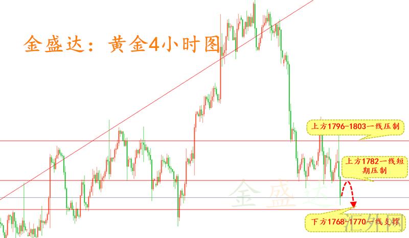 上图可以看出,卖方是大趋势,技术分析回弹上去就是给大家买跌的可能,但是这周报告较多,尤其是星期五大非农和美联储发言,我们务必要稳健把握,上方1778-1782一线形成了短时间的抑制位,以下支撑在1768-1770一线,操作上我们依旧是首要以回弹买跌为主,回踩买涨为辅,具体以本人实时给出策略为准!手里有持仓的朋友可以及时与我沟通交流,金盛达为你供应许多操作方案!