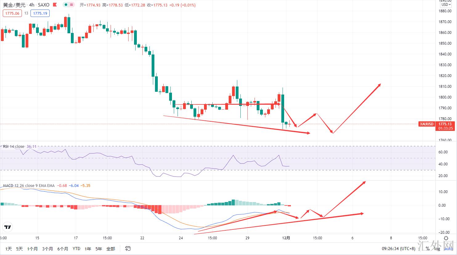 黄金4小时级别,对于4小时级别的预计,我在昨晚直播的时机讲的异常清楚,黄金在上周跌向1778后面开始保持低点盘整震荡,这和我以前的预计稍微有些不一样,以前的预计是黄金4小时短线筑底后面,会开始执行修正,不管是回弹修正依旧震荡修正,黄金全将迈出一定程度的上涨,但是黄金走的的确盘整震荡修正,这也是修正的一种形式,昨晚直播的时机提示,4小时MACD快慢线已经靠近修正完成了,要注意黄金显现新低。
