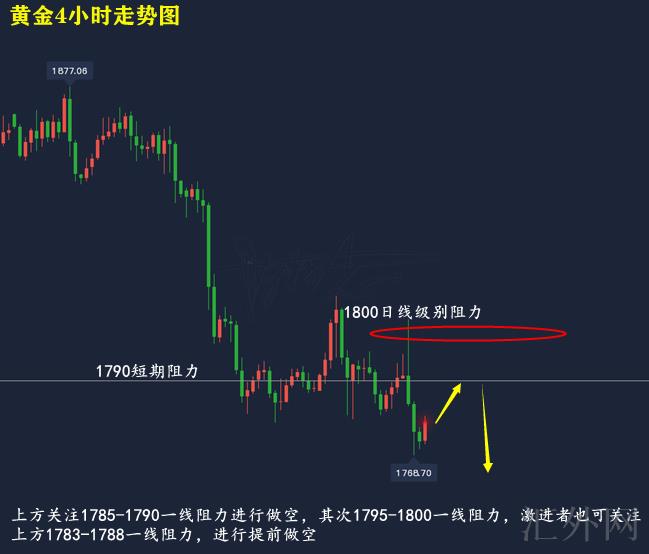 黄金技术分析来分析,日K线上,隔日黄金遇阻于MA10日移动均线展开下探,盘中先涨后跌,报得带长上影线的中阴,日K线上,今日行情开盘展开回涨,但当前仍收阻于抑制,日间恐会下探或冲顶回调;4小时上,隔日黄金开盘呈震荡上涨行情,在刺破上缘后走震荡下探下挫,并跌穿下缘持于低点盘整,目前布林带处在开口期,MA均线迈出双死叉后三线朝下,KDJ随机指标三线微微往上,MACD指标绿色量能柱连续放量,快慢线平行向前,综合来说,黄金当前上方抑制较强,日间推荐维持买跌,上方注意1785-1790一线压力,其次1795-1800一线压力,激进派也可依托1783-1788提早进场买跌。