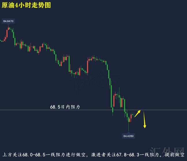 原油技术分析来分析,日K线上,隔日原油开盘适当上升遇阻于MA5日移动均线展开下探,盘中刺破下缘创下低后回涨,报得带上下影线的大阴,日K线上,今日原油开盘展开回涨,但上方均线抑制较强,预期恐会持续走跌;4小时上,隔日原油遇阻于MA10日移动均线呈震荡下探行情,持续下探,目前布林带处在开口期,MA均线三线朝下,KDJ随机指标三线并拢往上,MACD指标绿色量能柱连续放量,快慢线有往上弯钩趋势,综合来说,即使原油当前处在回涨,但均线抑制较强,日间推荐持续维持买跌,上方注意68.0-68.5一线压力,激进派注意67.8-68.3一线压力,提早进场买跌。