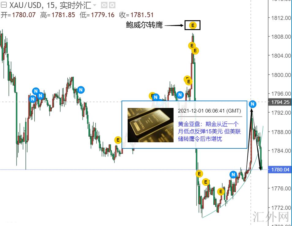 均为同样的预计鸽派做多盘,前期的讲话也的确符合市场的忧虑预计,可最终轮到自己表水的时机,立场就直接180度拐弯,我相信你们也看了今天的讲话数据,这鹰派色彩一点都不亚于9月份宣称11月缩债,这也是当时黄金能从1785直接转跌的原因,同样也是昨晚能在1808卖真相下挫的统治原因,再看看今天上午,突如其来的14美金做多盘固然猛烈,但后续的鹰派忧虑依旧让黄金价格在欧盘阶段走了完全性吐回。
