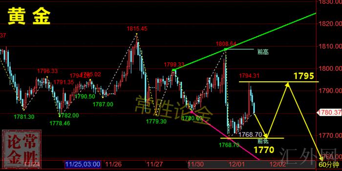 黄金趋势解析:星期三(12月1号)亚盘时间,黄金现货低点徘徊在1776美元左右,今日小非农报告将发布,买方是否起死回生?昨日黄金现货开盘1780左右一路上升,至美盘1808高位后,美联储主席鲍威尔对于加息的鹰派讲话,美指得到大幅提升,黄金价格狂泻迅速下挫到1770左右,程度差不多40美金。
