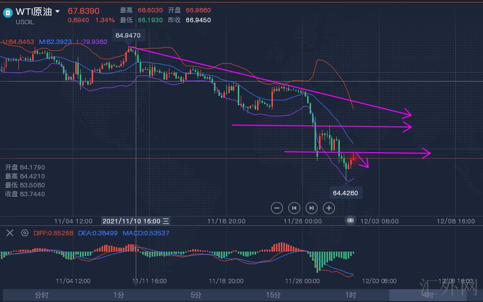 原油层面、昨日原油弱势下挫,凌晨摸底回涨,尽管昨日凌晨下挫形成极弱,但随后反抽表现也异常强势,早间走高击穿凌晨下挫开跌口67.3一线,小时线立稳布林带中轨并有收口态势,MACD也呈现背离,同期四小时技术指标呈现严重超卖,昨日凌晨极弱下挫但量能仍未增大反而缩减,所以凌晨下挫洗盘嫌疑很大,短时间原油大约率持稳面临调动,短时间的弱势下挫局势也将告一波落,后面环绕64-70震荡几率比较大。短时间原油强压68.7-68.8,可参考布局短空,以下支撑67.2和66.5.