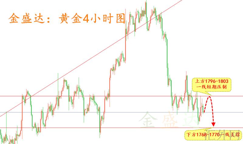 上图可以看出,卖方是大趋势,技术分析回弹上去就是给大家买跌的可能,但是这周报告较多,尤其是星期五大非农和美联储发言,我们务必要稳健把握,上方1796一线形成了短时间的抑制位,以下支撑在1768-1770一线,操作上我们依旧是首要以回弹买跌为主,回踩买涨为辅,具体以本人实时给出策略为准!手里有持仓的朋友可以及时与我沟通交流,金盛达为你供应许多操作方案!