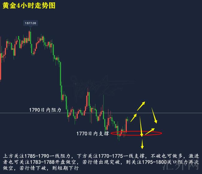 黄金技术分析来分析,日K线上,星期五黄金开盘适当上升后下挫,在创下日间低点后夜里展开回涨上升,但行情仍未打破MA10日移动均线抑制,报得中阳,日K线上,受于行情仍未打破均线抑制,同期月线也有抑制,下星期一仍有下挫机会,需上升,需打破1790-1800两大压力点;4小时上,星期五黄金持于中轨以下运行,盘中涨跌互现,夜里最多往上推涨,刺破中轨,目前布林带马上开口,MA均线马上迈出双金叉,KDJ随机指标三线并拢往上,到达超买,MACD指标红色量能柱连续放量,快慢线金叉往上,综合来说,黄金当前或短时间上涨趋势不足,面对回撤,下星期一推荐先空后多,上方注意1785-1790一线压力,以下注意1770-1775一线支撑,激进派也可注意1783-1788开盘买跌,同期关注上下击穿情形,若上方击穿,则依托1795-1800关键点位压力买跌,若以下击穿,则持续遇阻下探。