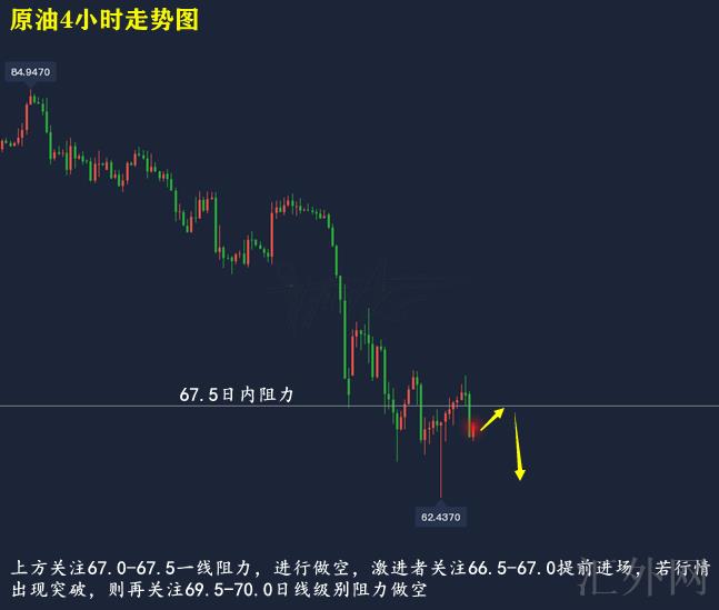 原油技术分析来分析,日K线上,星期五原油开盘展开上升,并在涨至日间高点后展开下探,吐回全部上涨趋势,由多转空,盘中报得带上影线的中阴,日K线上,当前原油处在遇阻当中,恐会持续下挫;4小时上,星期五原油呈震荡上涨行情,夜里最多刷新上缘后遇阻回调,目前布林带处在平口期,MA均线马上迈出双死叉,KDJ随机指标三线并拢朝下,MACD指标红色量能柱缩量,快慢线有朝下趋势,综合来说,原油当前上方均线抑制较强,仍有下探,下星期一交易参考回弹买跌,上方注意67.0-67.5一线压力,激进派注意66.5-67.0一线压力,若行情显现击穿,则再依托日K线级别压力69.5-70.0一线压力,执行买跌。