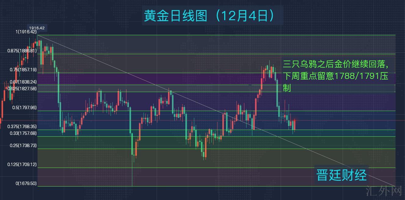 这周黄金开盘于1792.8美元每盎司,开盘适当回调后面于11月最后一个交易日冲顶创下高位到1808.7美元每盎司遇阻,星期四(12月2号)创下从11月4号迄今的低位到1761.9美元每盎司,星期五适当回弹,最终收盘于1783.2美元每盎司,下挫9.49美元,降幅0.53%,振幅2.61%。