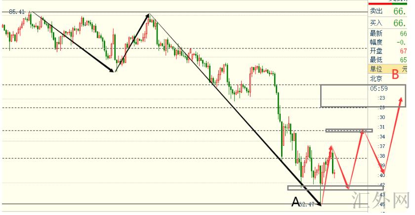 复盘结构:依照鑫顺波浪交易体系来说,从85.41开始的下挫已经告一波落,62.47极有机会形成阶段性的底部以及转向点,所以85.41~62.47暂定义为大A浪,从62.47开始定义为大B浪,当前处在B浪a当中,保持买方思路直至B浪b的下挫形态显现。后期B浪的全部回弹计划将令比较高,可以看至黄金分割50%~61.8%的区域73.90~76.60。