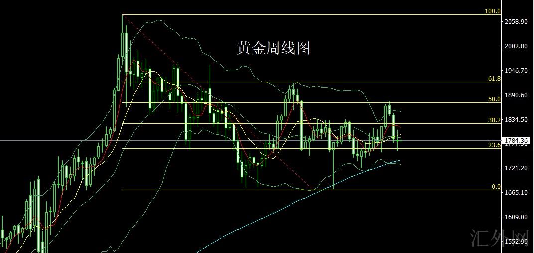 上周黄金交易市场周初开盘在1783.7的位置后行情大区间整理,周线最高刷新到了1808.8的位置后行情遇阻回调,最低给到了1761.65的位置后行情承受技术支撑和星期五非农影响收盘推涨,周线最终收线在了1784.3的位置后行情以一根上下影线差不多等长的长脚十字星形态收线.