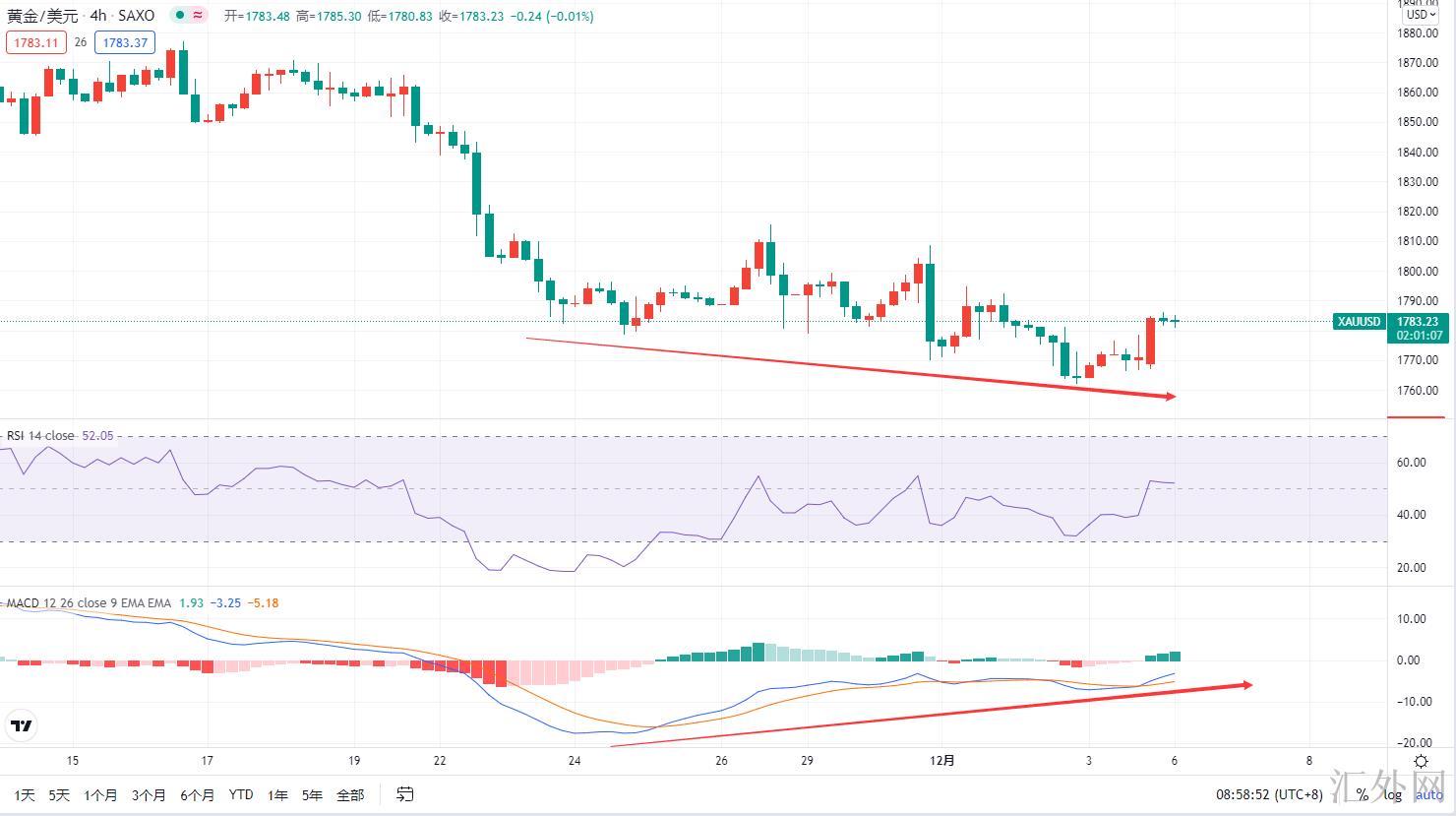 而在完成小时级别的回弹后面,行情又一次回调,在4小时级别上迈出三次底背离后面,黄金大约率就会完成底部的构筑,这个底部才是我一直等候的可能,预期大约率会在1760左右完成三次底背离,日K线级别筑底完成开始推涨!