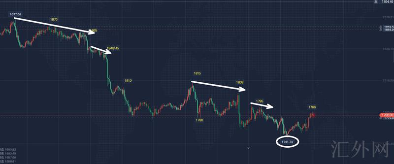 短线四小时图上一次小阴线慢跌探到1760低位左右轻微启稳,低点整理是拉起,从新回归了1780上方,在此之前的多空争夺点的位置,当前反抽证实顶底转换的压力,按4小时下挫浪形来说,当前仍处在1815构造的第三浪下挫当中,导致节奏受消息面影响,走得比较凌乱,没迈出极弱的单边下挫,而是伴随一步一回头的震荡下挫走法。