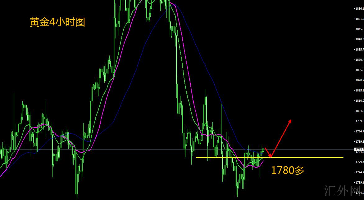 4小时图中一根长长的下影线,买方已定,持稳中轨上方看涨,触碰中轨可以直接进场多单,1780一线昨日虚破,显著有上升回弹的意思,这段上涨趋势起步后起码有30美金的行情,目睹1810一线,诚然在这以前,金金昨日也是带投资朋友拿了10多美金的卖方行情,多空双杀,跟上就是赚到。