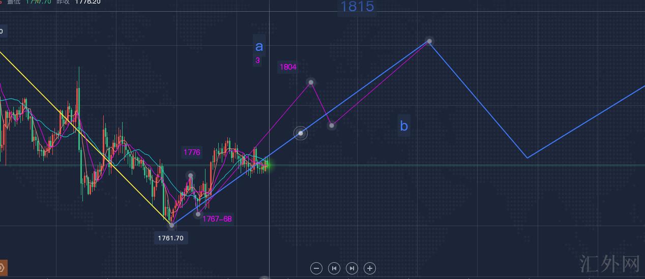 3、C-3-2浪的细分:在大浪的基础上,我们对a浪持续执行细分。锯齿浪一般走5-3-5浪型,故将a浪细分成驱使5浪结构,由顶部1815(推演而出)和底部1761-62,我们可推演出小1浪顶部位于1776左右,2浪位于1767左右!行情按计划展开,1776和1767皆形成行情反转的转折点位,故当前笔者判定行情正处在小浪增速上涨阶段!