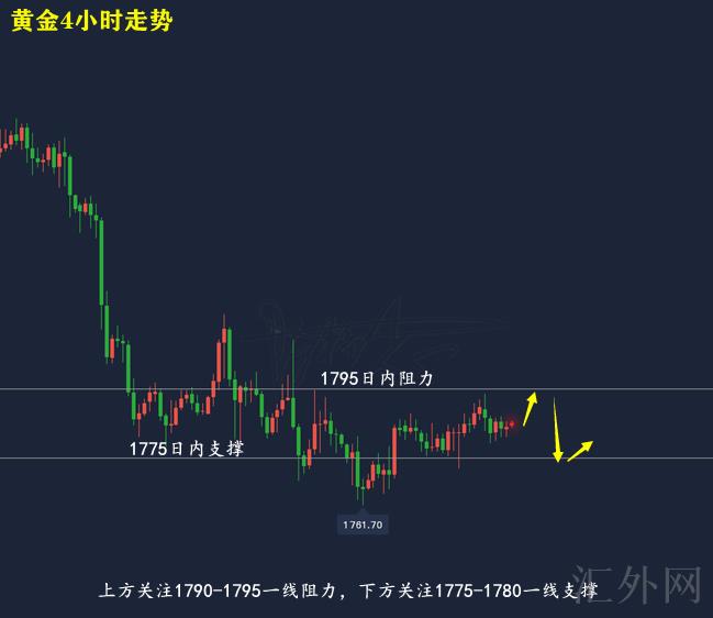黄金技术分析来分析,日K线上,星期三黄金开盘上升,并在涨至日间高点后回调,并在跌向MA5日移动均线位置后适当回涨,报得小阴十字星,日K线上,今日行情开盘持续持于MA5日移动均线上方运行,预期恐会持续持于盘整,因仍未打破千八关键点位位置,也然而分看多;4小时上,星期三黄金开盘呈震荡上涨连阳上升刺破上缘后震荡下探,并在跌穿中轨位置后回涨持于中轨左右交投,目前布林带处在平口期,MA均线马上迈出双死叉,KDJ随机指标三线并拢朝下,MACD指标顶背离,快慢线死叉朝下,综合来说,黄金当前短时间上涨不足,但日K线均线支撑仍未跌穿,日间交易参考高空低多,上方注意1790-1795一线压力,以下注意1775-1780一线支撑。