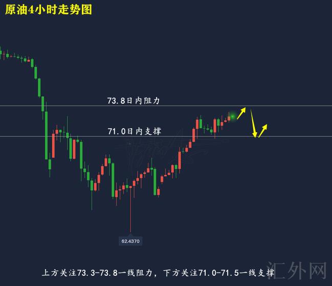 原油技术分析来分析,日K线上,星期三原油开盘短暂持于盘整后下跌至涨,又一次上升,报得带上下影线的小阳,日K线上,今日早间开盘原油又一次刺破73.0关键点位位置,但伴随技术分析持续枯竭,然而分看多;4小时上,星期三原油短暂持于盘整后夜里展开震荡上涨,目前布林带处在开口期,MA均线三线向前,KDJ随机指标三线并拢往上,MACD指标红色量能柱开始缩量,快慢线平行向前,综合来说,原油或上涨趋势不足,日间交易参考先空后多,上方注意73.3-73.8一线压力,以下注意71.0-71.5一线支撑。