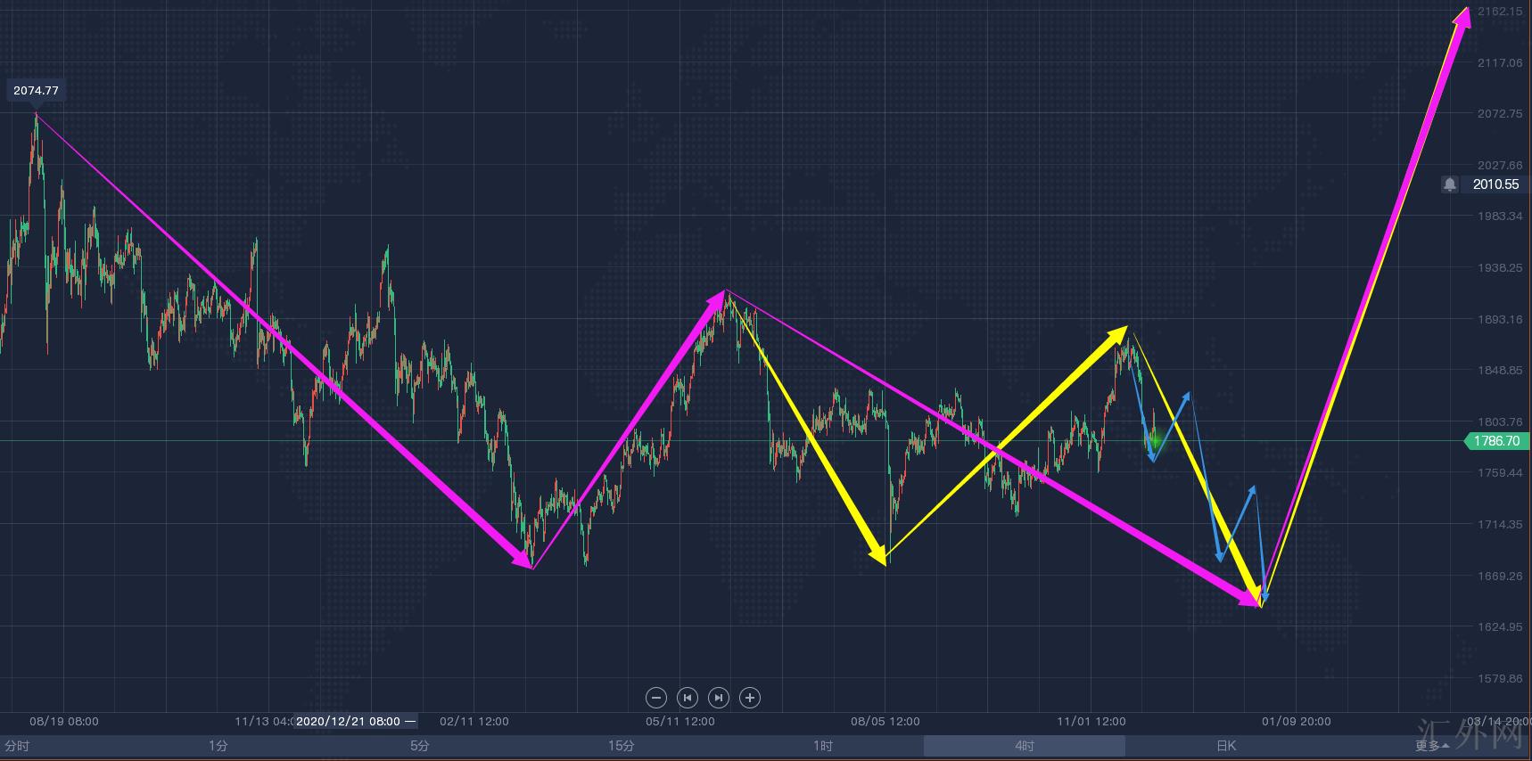 我们抽取两种的结合点就是1760-1770名置,不管哪一种全将在这个区间内止跌后开始回弹,所以后市操作上理应以此位置布局多单,去试图做波段持有,具体看第一次的反抽强度来定程度(总的来说,不论哪种,这个回弹程度都不会小)
