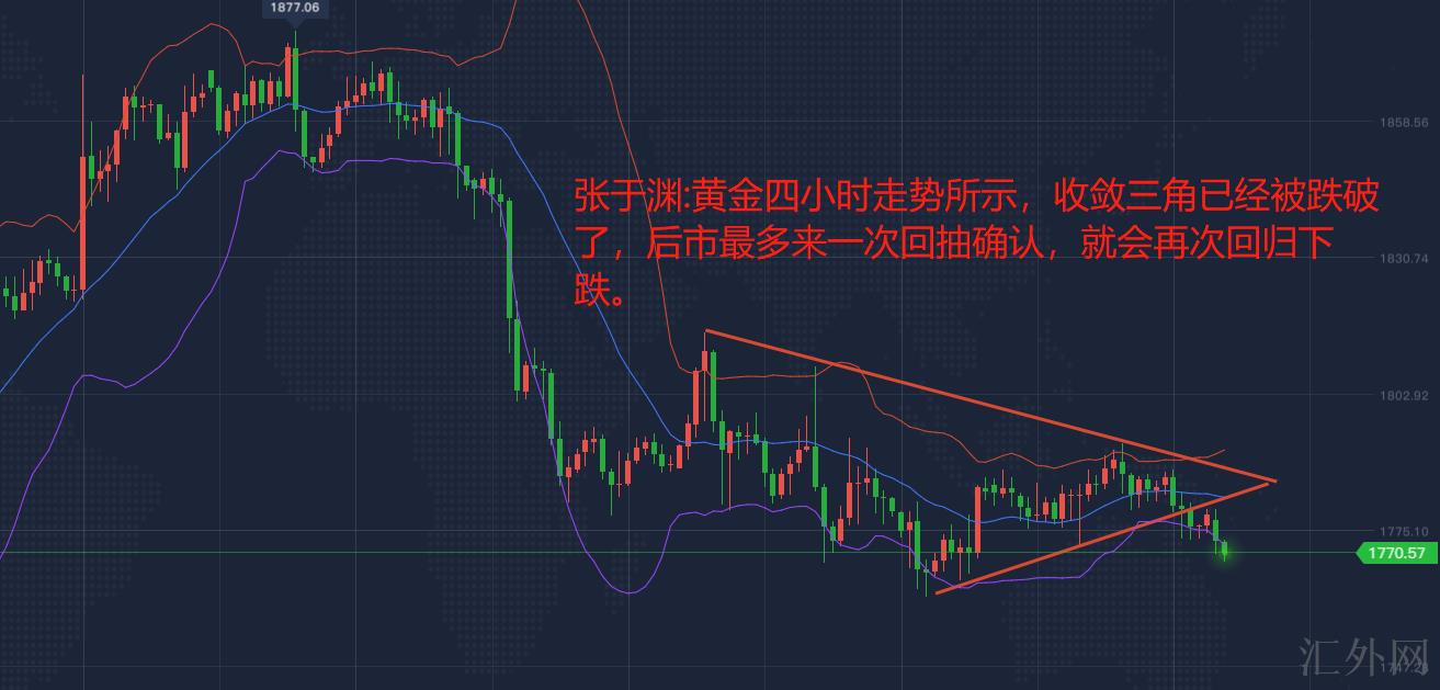 从黄金日K线上黄金价格的下挫通道完好无一损,形态上就是一个卖方形态,所以没有理由去逆势干多,诚然,以刷手续费为目的就除外了。下周美联储将执行利率会议,笔者预期市场有机会是在等这个结果公布。所以一波时间以来交投清淡,震幅不大。四小时行情所示,收敛三角已经被跌穿了,后市最多来一次回抽证实,就会又一次回到下挫。既然日K线形态看跌,四小时形态看跌,那就是哪里入场空的困难了。隔夜黄金价格连续未能冲出1785一线,这是显著的卖方态势,大阴线直接抵达布林带下缘,跳水是必然的,以下支撑点1760一线,一旦突破就是瀑布,1778现价空中,回弹持续买跌!