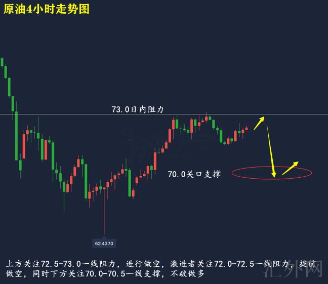 原油技术分析来分析,日K线上,星期五原油开盘创下低后回涨,并报得中阳,日K线上,即使原油在星期五收回了最近的部分下跌趋势,但技术分析仍是超买,仍有回调的机会性;4小时上,星期五原油开盘适当下挫创下低后,一阳一阴呈迟缓上升,并刺破中轨,目前布林带处在收口期,MA均线迈出金叉,KDJ随机指标三线并拢往上,到达超买,MACD指标绿色量能柱适当缩量,快慢线平行向前,综合来说,原油当前短时间或上涨不足,下星期一推荐回弹买跌,上方注意72.5-73.0一线压力,激进派注意72.0-72.5一线压力,提早买跌,同期以下注意70.0-70.5一线支撑,不破也可执行买涨。