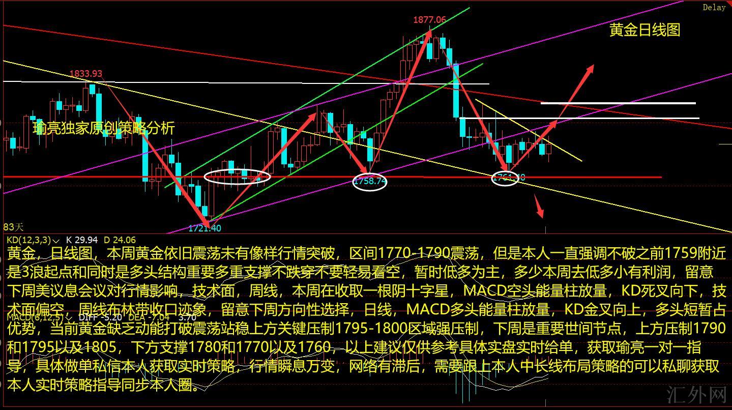 黄金,日K图,这周黄金依旧震荡未有像样行情击穿,区间1770-1790震荡,但是本人一直强调不破以前1759左右是3浪起点和同期是买方结构重要多重支撑不跌穿不要轻易看跌,临时低多为主,多少这周去低多小有好处润,留心下周美议息会议对行情影响,技术分析,周线,这周在收取一根阴十字星,MACD卖方能量柱放量,KD死叉朝下,技术分析看空,周线布林带收口态势,留心下周方向性选择,日K线,MACD买方能量柱放量,KD金叉往上,买方短暂占优势,目前黄金缺乏量能打破震荡立住上方核心抑制1795-1800区域强抑制,下周是重要世间节点,上方抑制1790和1795以及1805,以下支撑1780和1770以及1760,以上推荐仅供参考具体实盘实时给单,获取瑜亮一对一指导,具体做单私信本人获取实时策略,行情瞬息万变,网络有落后,需求跟上本人中长线布局策略的可以私聊获取本人实时策略指导同步本人圈。