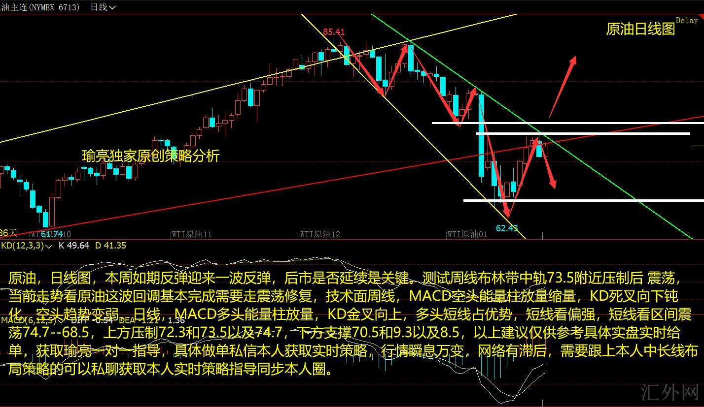 原油,周线图,这周按计划回弹面临一次回弹,后市能否保持是核心。试探周线布林带中轨73.5左右抑制后 震荡,目前行情看原油这段回踩差不多完成需求走震荡修复,技术分析周线,MACD卖方能量柱放量缩量,KD死叉朝下钝化,卖方趋势变弱,日K线,MACD买方能量柱放量,KD金叉往上,买方短线占优势,短线看偏多,短线看区间震荡74.7--68.5,上方抑制72.3和73.5以及74.7,以下支撑70.5和9.3以及8.5,以上推荐仅供参考具体实盘实时给单,获取瑜亮一对一指导,具体做单私信本人获取实时策略,行情瞬息万变,网络有落后,需求跟上本人中长线布局策略的可以私聊获取本人实时策略指导同步本人圈。
