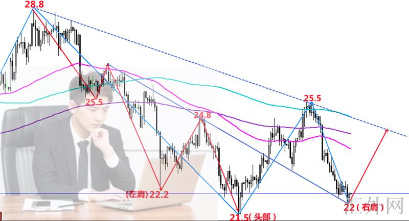 白银前期高点回调到21关键点位进而减轻下跌趋势,随后面临了连阳回弹到25.5左右滞涨,多次打击25.5高点未能击穿,最终面临大幅回调。当前白银遇阻25.5高点又一次跌至22关键点位,此波下跌趋势直线下探强度比较显著!当下白银徘徊22关键点位有希望止跌形成头肩底形态,从整体形态来说左肩位于22关键点位,底部位于21.5名置,当下右肩也是与左肩齐平于22关键点位,而目前右肩位置刚好也是26.8—24.8下探趋势线支撑点,综合上述白银有希望依托22关键点位展开回弹回涨,进而形态头肩底反转形态,白银将有希望回弹回涨。若是22关键点位不能止跌,那么预期白银将要跌穿21再创新低,操作上可以在22关键点位布局多单看下回弹,就看涨头是否抓住此救命稻草展开回弹回涨,顺势的话依旧维持回弹23左右看跌。
