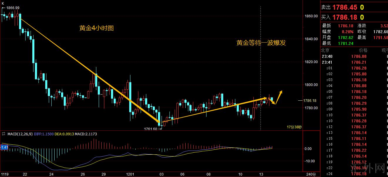 日间最高在1791左右,刷新后迅速下挫到1782,表明1791是上方重要的阻力位置,想要持续上升,那么务必立稳1791的阻力位,美盘黄金下挫后又一次回弹,表明短时间趋势看多头,结合结构来说,黄金在底部形成双底,有持续击穿的痕迹,启昭更斟酌布局黄金的多单。