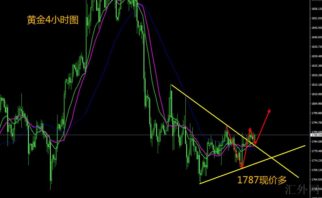 4小时图中,黄金击穿三角震荡区间,当前回踩支撑,1787可以直接多单进场,上方计划1800,迎接星期四的利率会议以前,黄金必然仍有波推涨行情,把握住这段任然能赚取丰厚的利润,想赚钱就买涨,顺势者翻倍,逆势者爆仓,金金方向替各位投资朋友准确把握,只管冲刺!