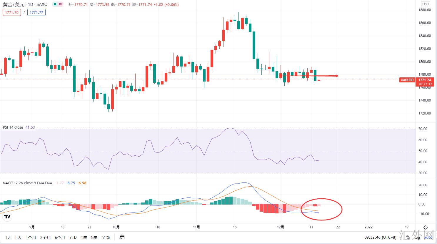 4小时上,MACD快慢线一直在0轴左右反复金叉死叉,RSI也一直运行在常态区间,在4小时级别上仍未目睹显著的顶底形态,所以只能把隔夜黄金的回调理解为正常的区域震荡,并没有突破的痕迹。黄金的区域震荡行情已经说了很久了,而且很有机会将是日K线级别的,周期比较大,震荡的时间肯定也是比较久的,所以只要没有跌穿前低,那么黄金在4小时上就是一个震荡上涨,不要认为降幅或者升幅略微大一点,就是要突破了。