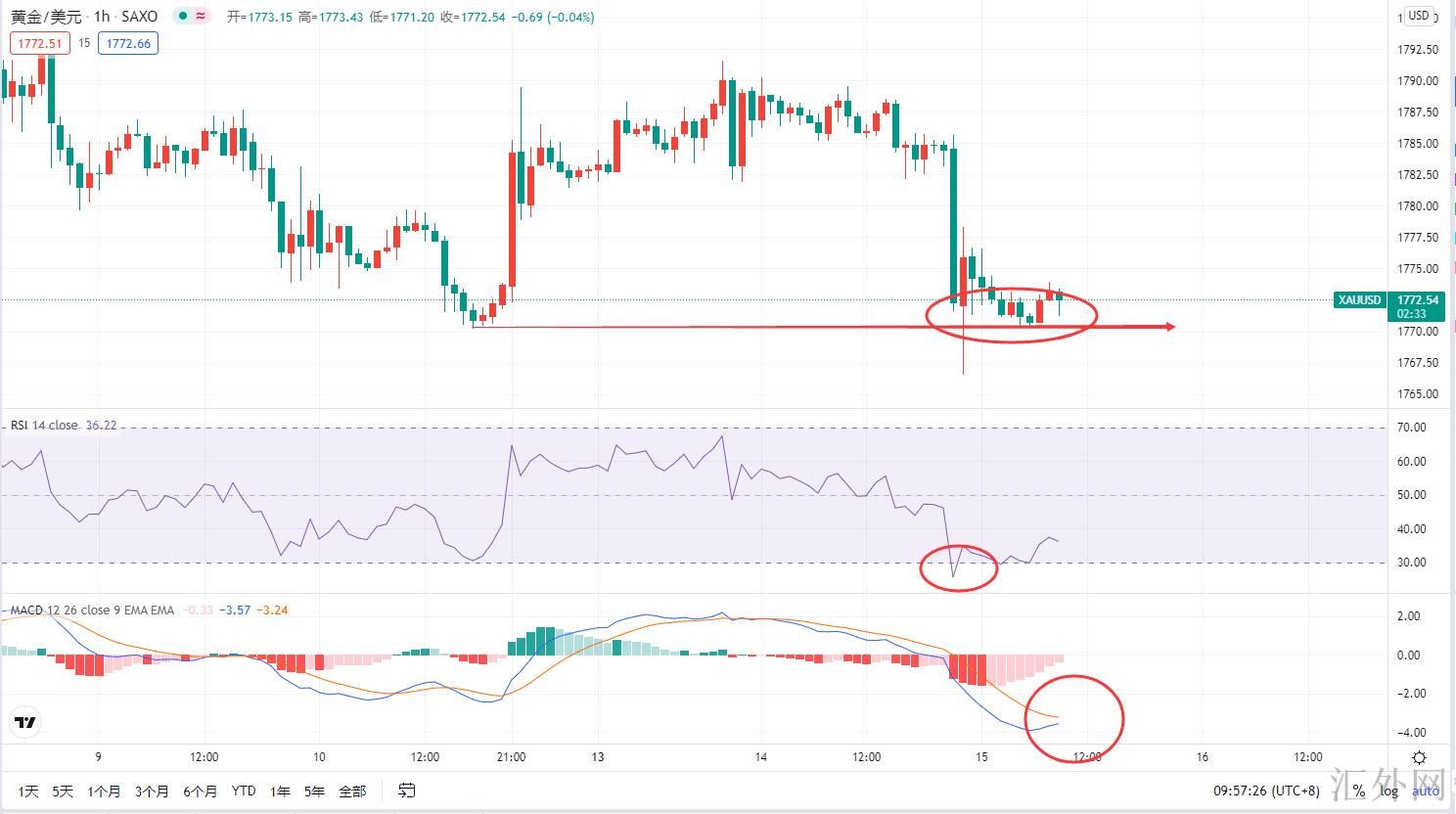 黄金小时级别,黄金隔夜迈出较大程度的回调,但是仍未迈出新低,在前期低位1770一线遭遇支撑后面开始回弹,当前来说,小时级别已经见到显著底部,隔夜的回调产生了小时级别RSI的超卖,MACD快慢线低点萎缩黏合即将金叉,结合以上对日K线和4小时的分析,我觉得黄金的区域回调已经终结了,接下去就是回弹,持续在区间内震荡运行,上方抑制可见1780/1787/1790/1795,震荡区间的上沿仍需要试探才可证实。