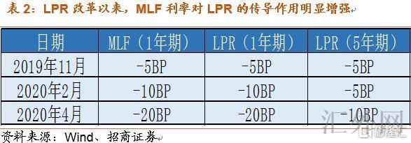 改革后,MLF利率发挥基准作用,对LPR的影响力明显加强。基于LPR报价机制设计,LPR执行“MLF利率+基点”的方式形成,MLF利率对LPR起到基准作用。《货币政策实施数据》(2020年二季度)表示:“作为中期政策利率,MLF利率与作为短时间政策利率的公开市场操作利率共同形成中央银行政策利率系统,传达了中央银行利率调控的信号,其通过边际效应付市场利率起决定性作用。”回溯可见,LPR改革以来,MLF的三次向下调整都导致1年期LPR的“同向同幅”回调与5年期LPR“同向窄幅”变动,MLF对LPR的传播力明显加强。