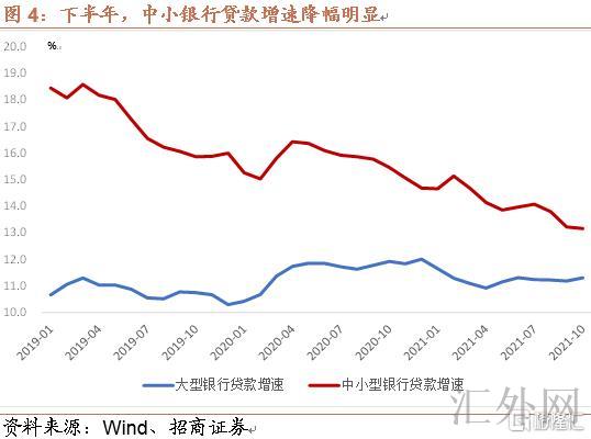 二是,目前经济事态致使银行需求维持较高风险溢价,进而降低LPR下探活力。同为LPR报价的基点影响要素,风险溢价的提高或许会抵消资金成本下滑导致的红利。目前,经济下探阻力加大、恒大等房地产违约事件时有发生,银行面对较为突出的市场风险。对此,银行需求维持较高的风险溢价来弥补违约损失。通过对比不同范围银行贷款增速的改变,可以从侧面执行验证。下半年,中小银行贷款增速降幅胜过大型银行。受于两类银行面向的客户存在显著的信用差距,中小银行贷款增速大幅下探从侧面表明该类银行在惜贷与风险之间执行选择,中小银行有维持高风险溢价的客观需求。由于2019年的LPR改革增长了中小银行在LPR报价形成中的权重,所以中小银行的利益诉求还将在本轮报价中得以体现。