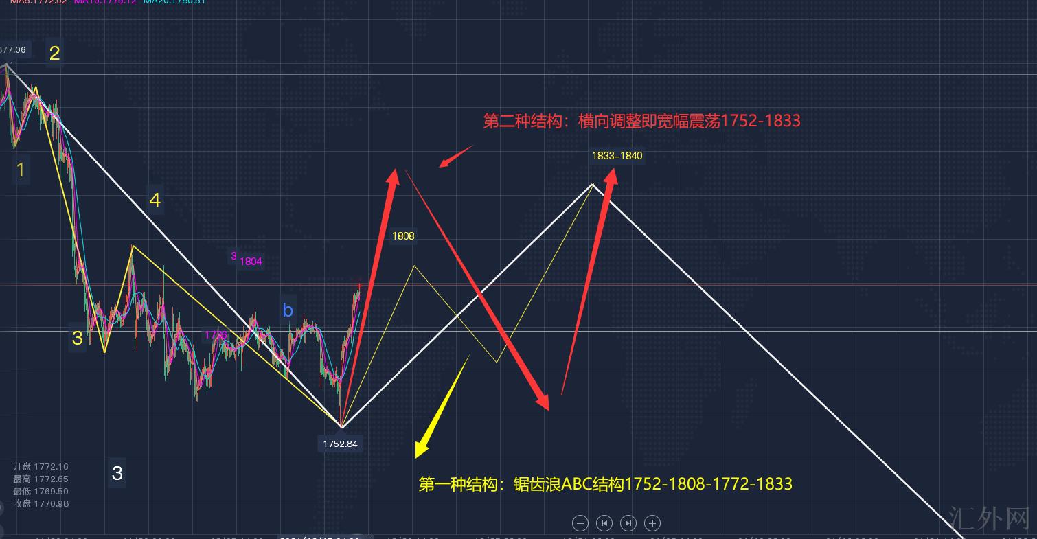 1、大一级波浪结构:当前行情突破1761一线,最低回调到1752左右,原C-3-1浪结构已突破,需从新做相应的调动!当前可将1752作为C-3-1浪的底部,即C-3-1浪(1877-1752)已完成,行情正处在C-3-2浪回弹当中!
